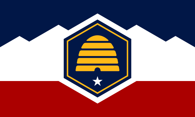 The current flag of Utah, also known as the beehive flag, was adopted on March 9, 2024. The red, white, and blue tricolor references the colors of the flag of the United States. At the top, a blue stripe symbolizes Utah’s skies and lakes and fundamental principles such as faith, knowledge, and freedom. It also imitates the blue background of the state’s historic flag. The white middle stripe evokes peace and is divided into five peaks, representing the snowy peaks of Utah’s mountains. Below, a red canyon stripe signifies Southern Utah’s desert landscapes and the spirit of perseverance. In the center of the flag, a beehive design represents Utah’s industrial character and official nickname, the Beehive State. The gold hexagon resembles honeycomb, representing the strength of Utah’s people. The beehive within the hexagon symbolizes industry, prosperity, and unity. Below the beehive is a five-pointed star, which honors the five original tribal nations in Utah, and also alludes to Utah’s 45th star on the American flag, representing the state’s allegiance to the nation.
